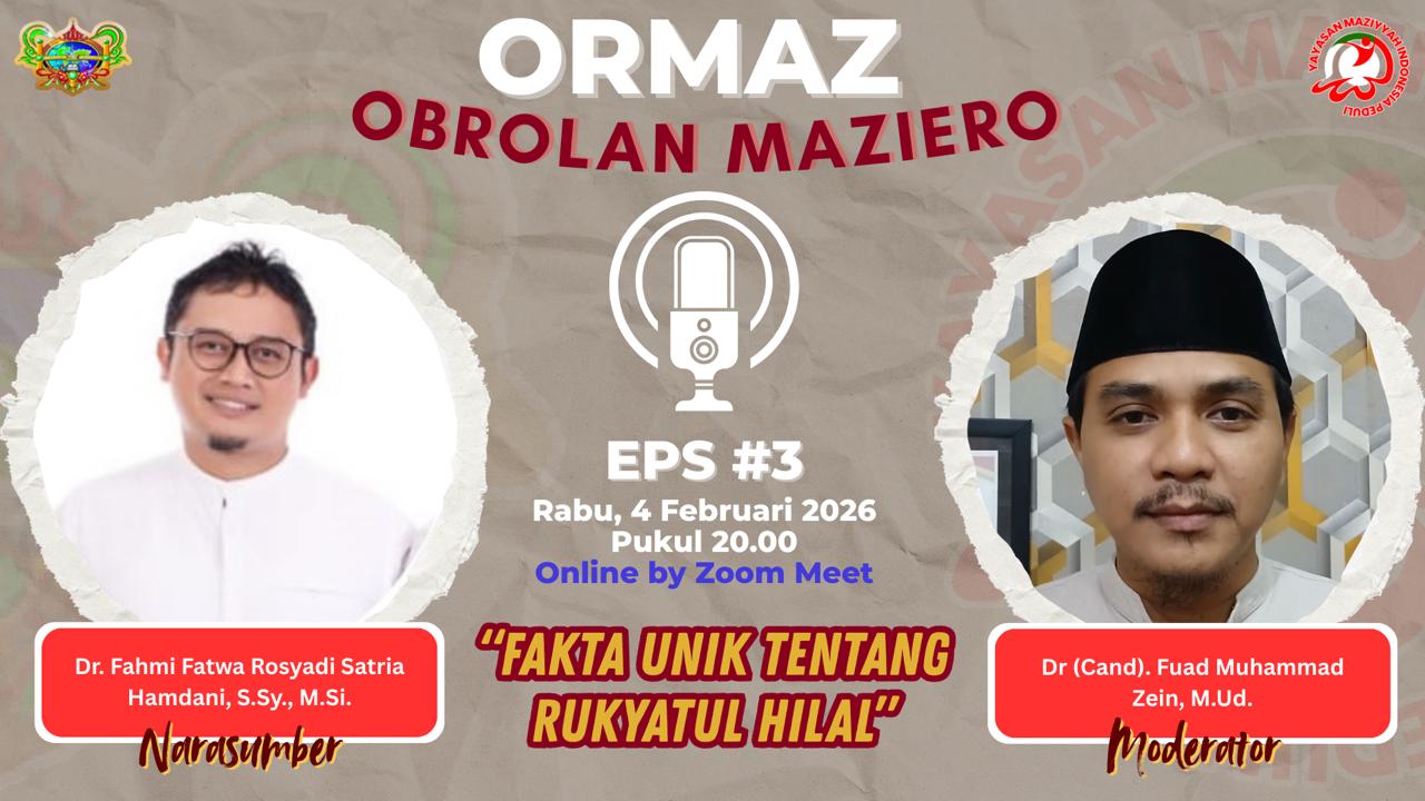 PONOROGO–Yayasan Maziyyah Indonesia (YMI) Peduli kembali menggelar Obrolan Maziero (Ormaz) Episode 3 yang kali ini mengangkat tema “Fakta Unik tentang Rukyatul Hilal”. Kegiatan ini dijadwalkan berlangsung pada Rabu, 4 Februari 2026, pukul 20.00 WIB hingga selesai, dan dilaksanakan secara daring melalui Zoom.